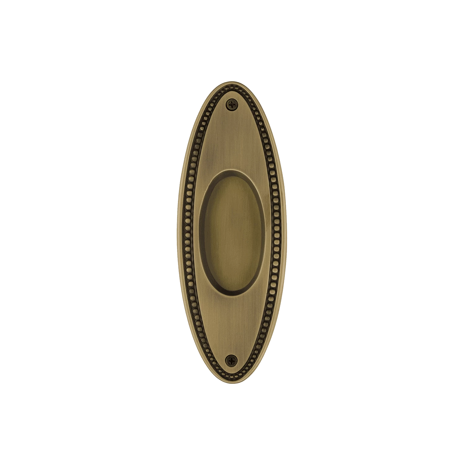 The solid brass Beaded Flush Pull with its decorative oval shape is fashionable, yet functional on pocket doors, sliding doors, cabinet doors or any door where a flush with the door face pull is needed. With its beaded design and oval shape, itβs a beautiful yet classic piece for your home.