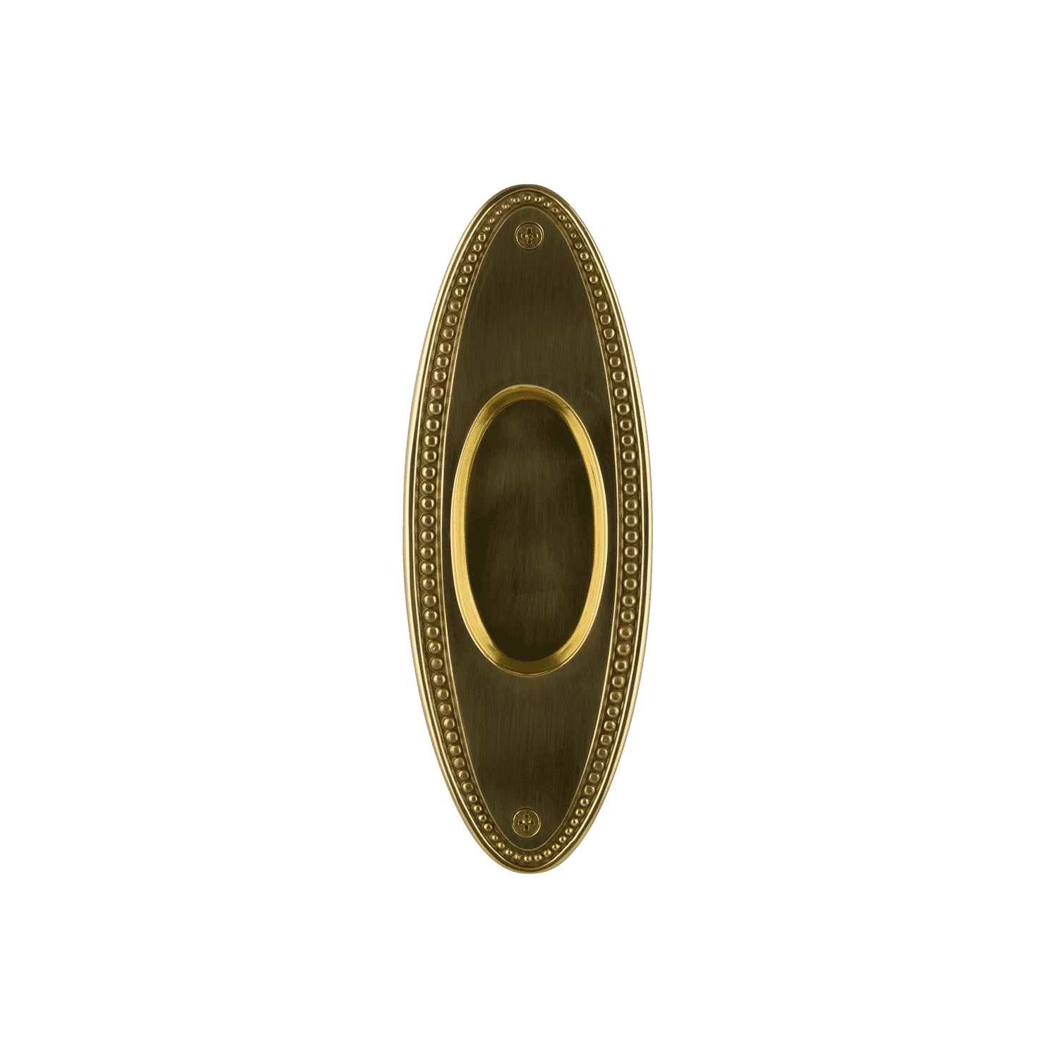 The solid brass Beaded Flush Pull with its decorative oval shape is fashionable, yet functional on pocket doors, sliding doors, cabinet doors or any door where a flush with the door face pull is needed. With its beaded design and oval shape, itβs a beautiful yet classic piece for your home.