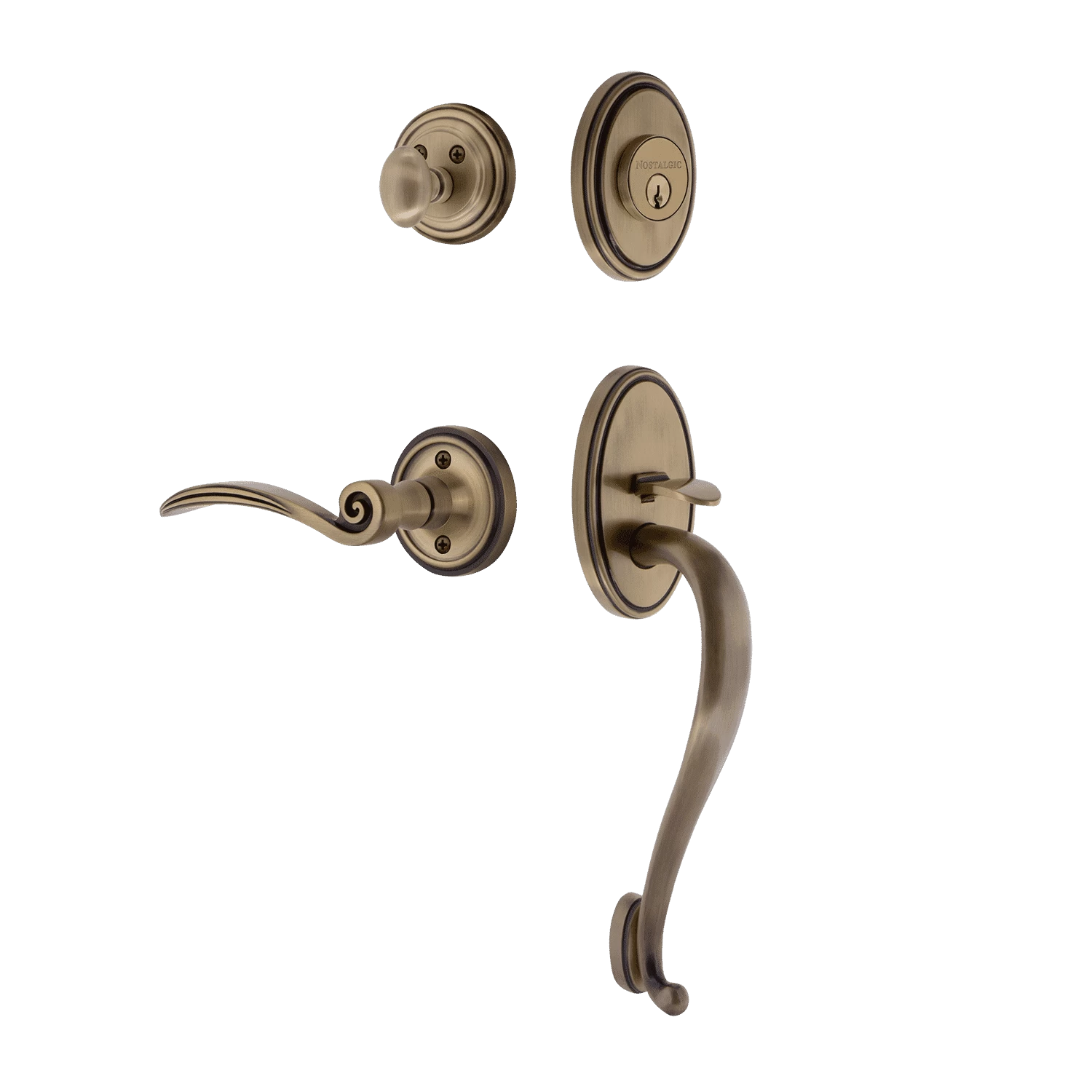 Be the first to review “Classic Handleset With S-Grip And Classic Rosette With Swan Lever In Antique Brass” Cancel reply