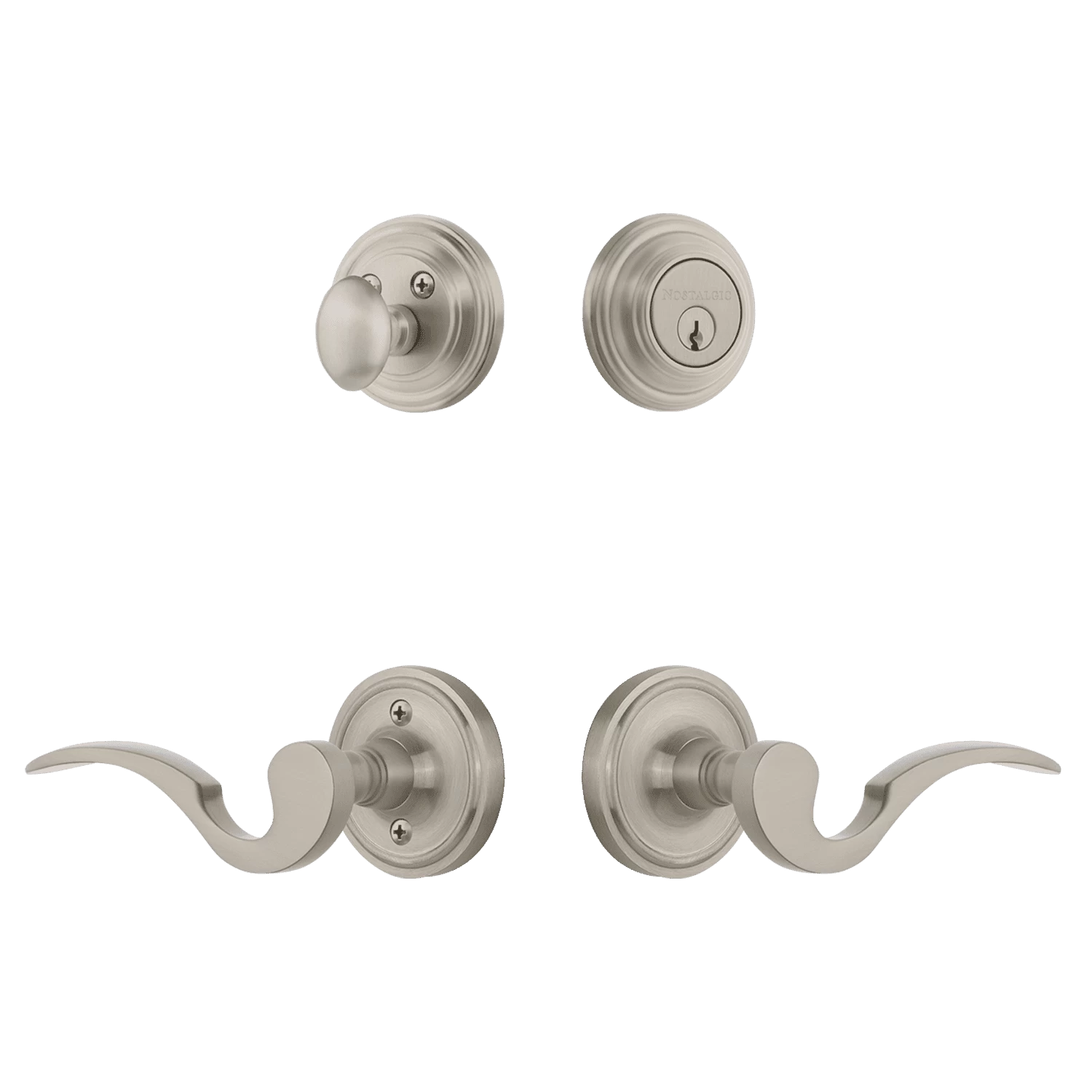 The simple elegance of the round Classic Rosette Entry Set offers beauty and durability that will complement a variety of architectural styles. The gentle contour and notched recess of the Manor lever lend an understated sense of refinement. The single-cylinder deadbolt features top-quality internal components for smooth, long-lasting operation. All Nostalgic Warehouse products are made from solid forged brass for durability and beauty.