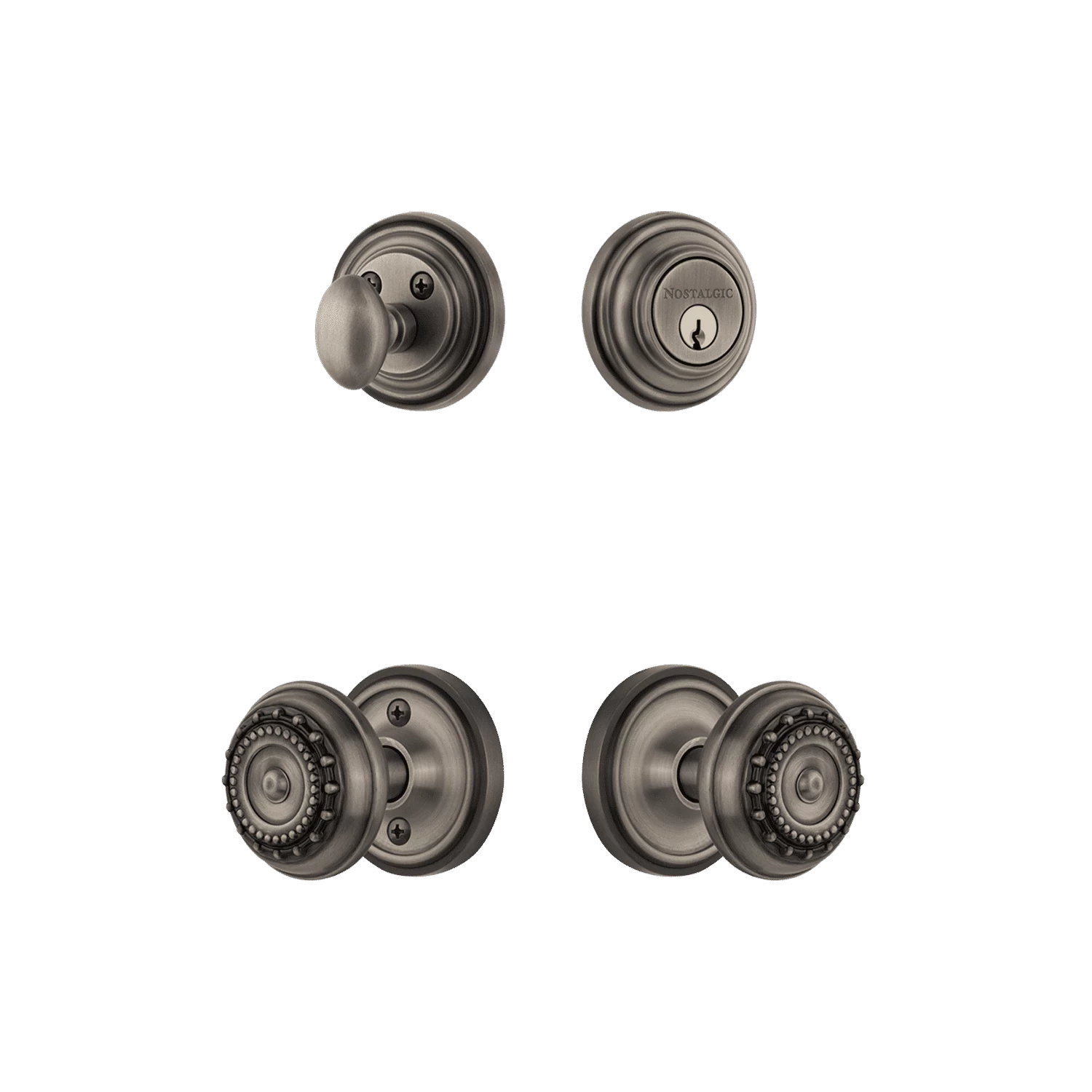 The simple elegance of the round Classic Rosette Entry Set offers beauty and durability that will complement a variety of architectural styles. Add the Meadows Knob, with its captivating design, for a stylish and detailed look.  The single-cylinder deadbolt features top-quality internal components for smooth, long-lasting operation. All Nostalgic Warehouse products are made from solid forged brass for durability and beauty.