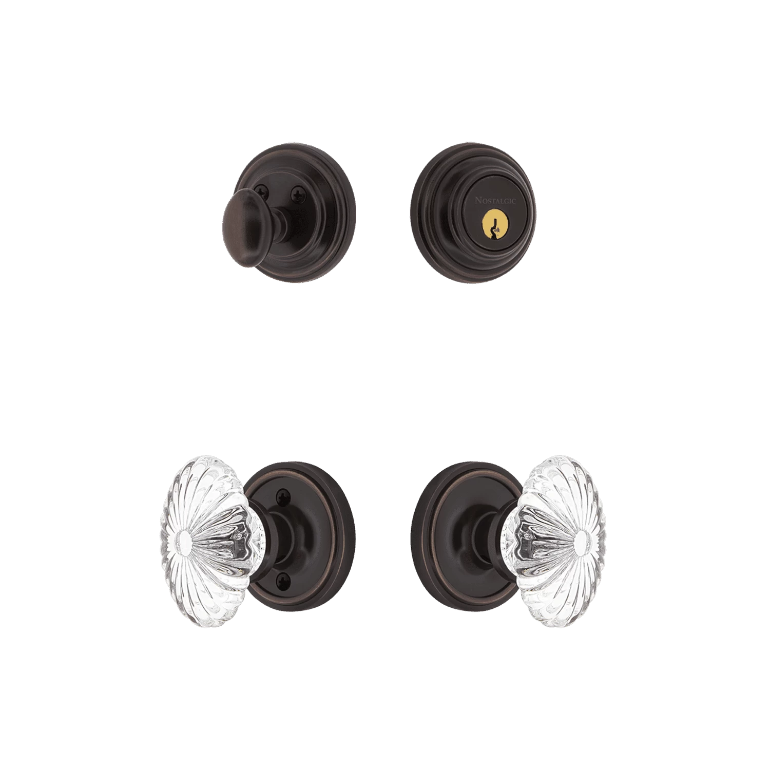 The simple elegance of the round Classic Rosette Entry Set offers beauty and durability that will complement a variety of architectural styles. Add remarkable elegance with the Oval Fluted Crystal knob and its 24 individual hand-ground facets. The single-cylinder deadbolt features top-quality internal components for smooth, long-lasting operation. All Nostalgic Warehouse products are made from solid forged brass for durability and beauty.
