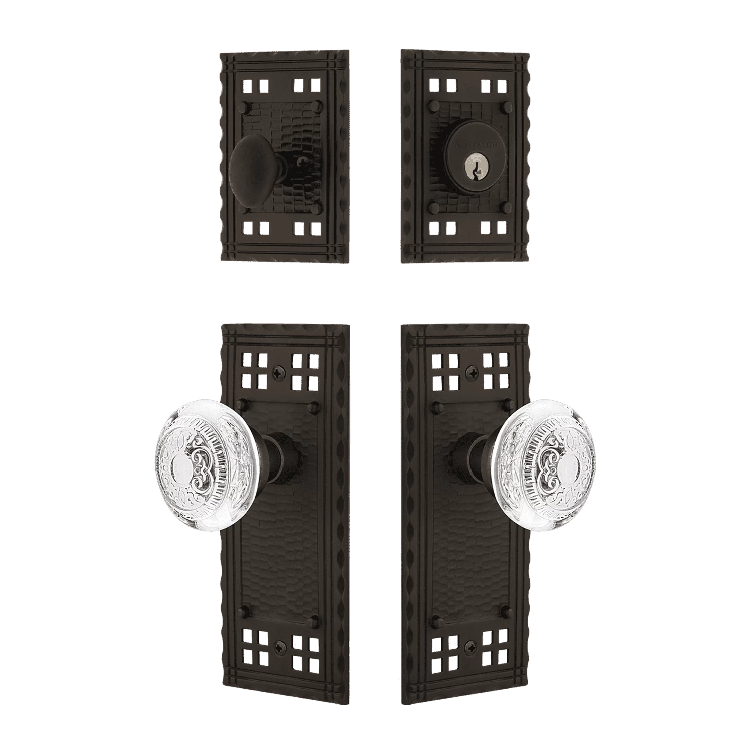 Inspired by the American Arts & Crafts movement of the early 1900s, the rugged design and hand-hammered details of the Craftsman Entry Set emphasize handwork over mass production. The distinct, Crystal Egg & Dart knob highlights a repeating border detail and floral crown center with the added reflection of crystal. The single-cylinder deadbolt features top-quality internal components for smooth, long-lasting operation. All Nostalgic Warehouse products are made from solid forged brass for durability and beauty.