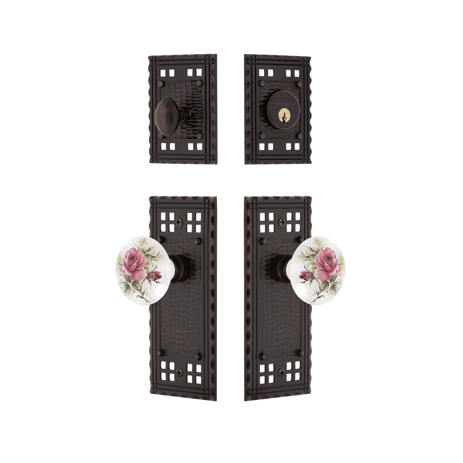 Inspired by the American Arts & Crafts movement of the early 1900s, the rugged design and hand-hammered details of the Craftsman Entry Set emphasize handwork over mass production. Nothing says “vintage” like the traditional floral illustration on the Rose Porcelain knob. The single-cylinder deadbolt features top-quality internal components for smooth, long-lasting operation. All Nostalgic Warehouse products are made from solid forged brass for durability and beauty.