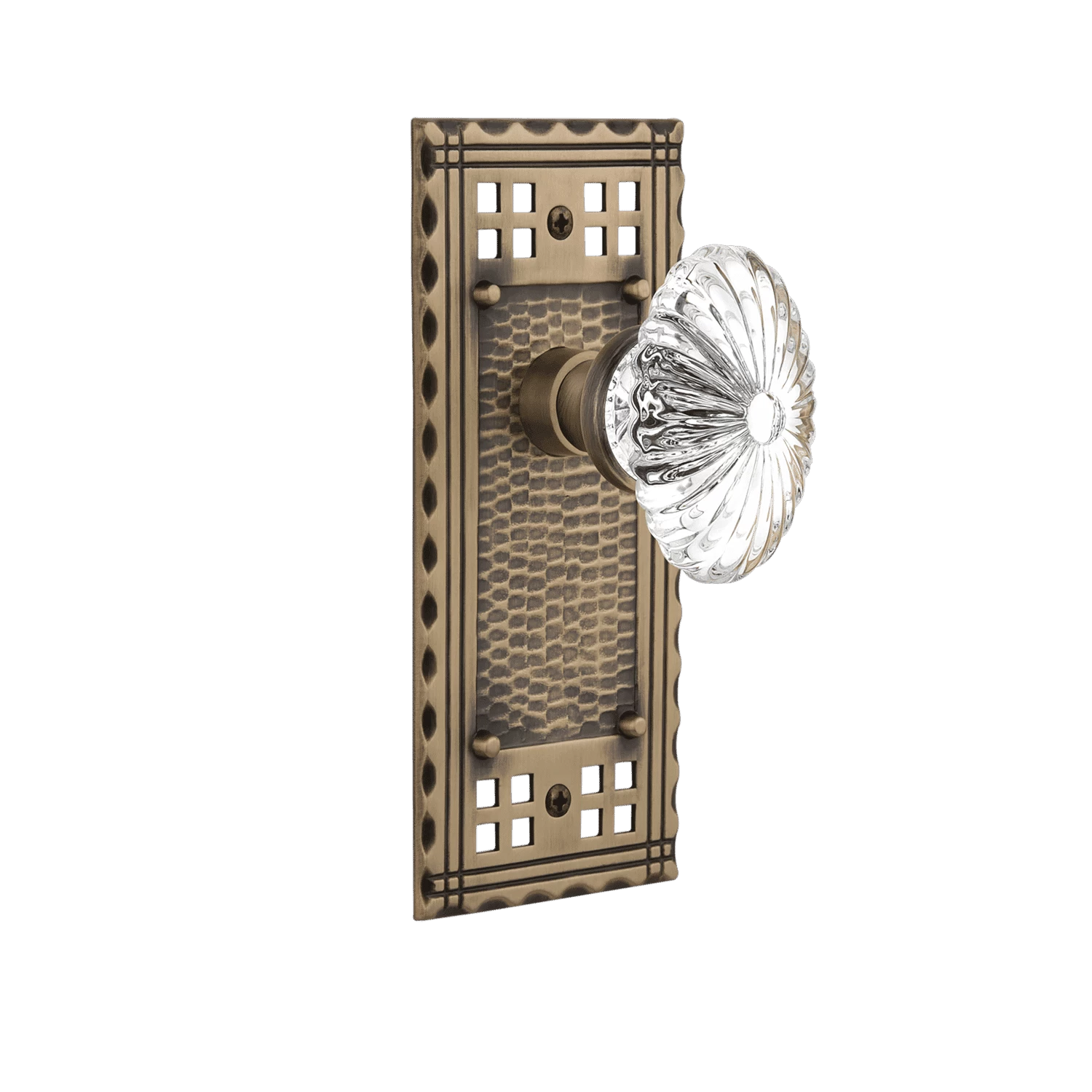 Inspired by the American Arts & Crafts movement of the early 1900s, the rugged design and hand-hammered details of the Craftsman Long Plate emphasizes handwork over mass production. Combined with our Oval Fluted Crystal door knob (24 individual hand-ground facets!), the look is elegant, but never fussy.