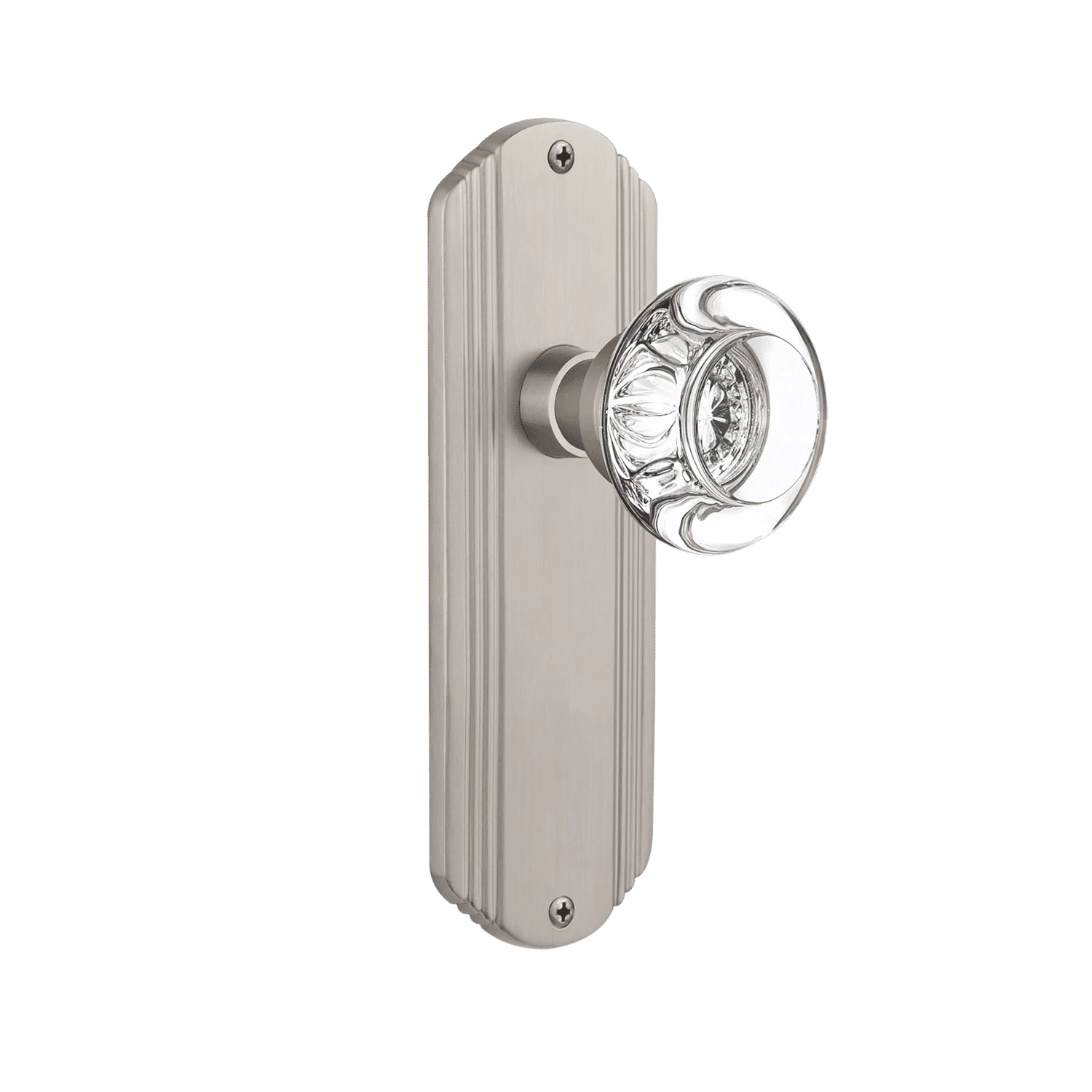 The Deco Plate brings to mind old Hollywood, jazz, and The Great Gatsby, all of which inspire a modern twist on great classics from the past. Adding our Round Clear Crystal door knob, which features a circular shape that magnifies the beautiful facets underneath, only serves to bring the past alive.