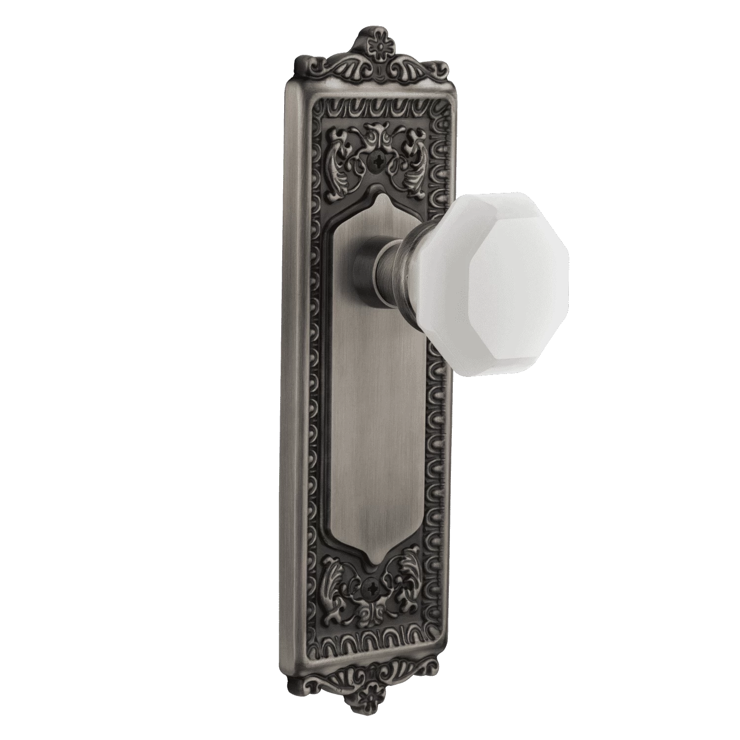 With its distinctive repeating border detail, as well as floral crown and foot, the Egg & Dart Plate resonates grand style and is the ideal choice for larger doors. Popular in the 1920s, particularly in bathrooms, the translucent white milk glass knobs were a staple in almost every home.