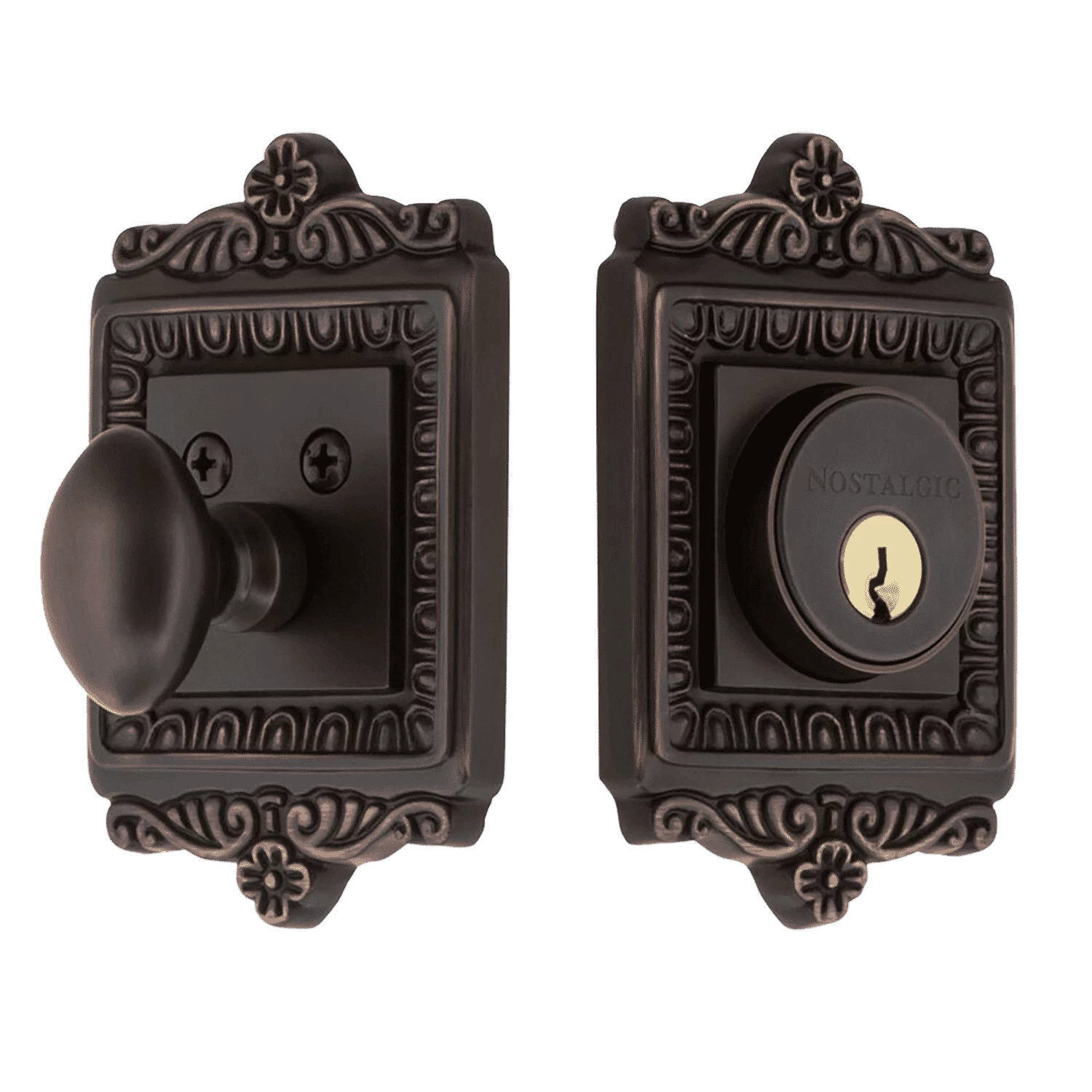 With its distinctive repeating border detail, as well as floral crown and foot, the Egg & Dart Deadbolt resonates grand style. Made of solid (not plated) forged brass for durability and beauty.