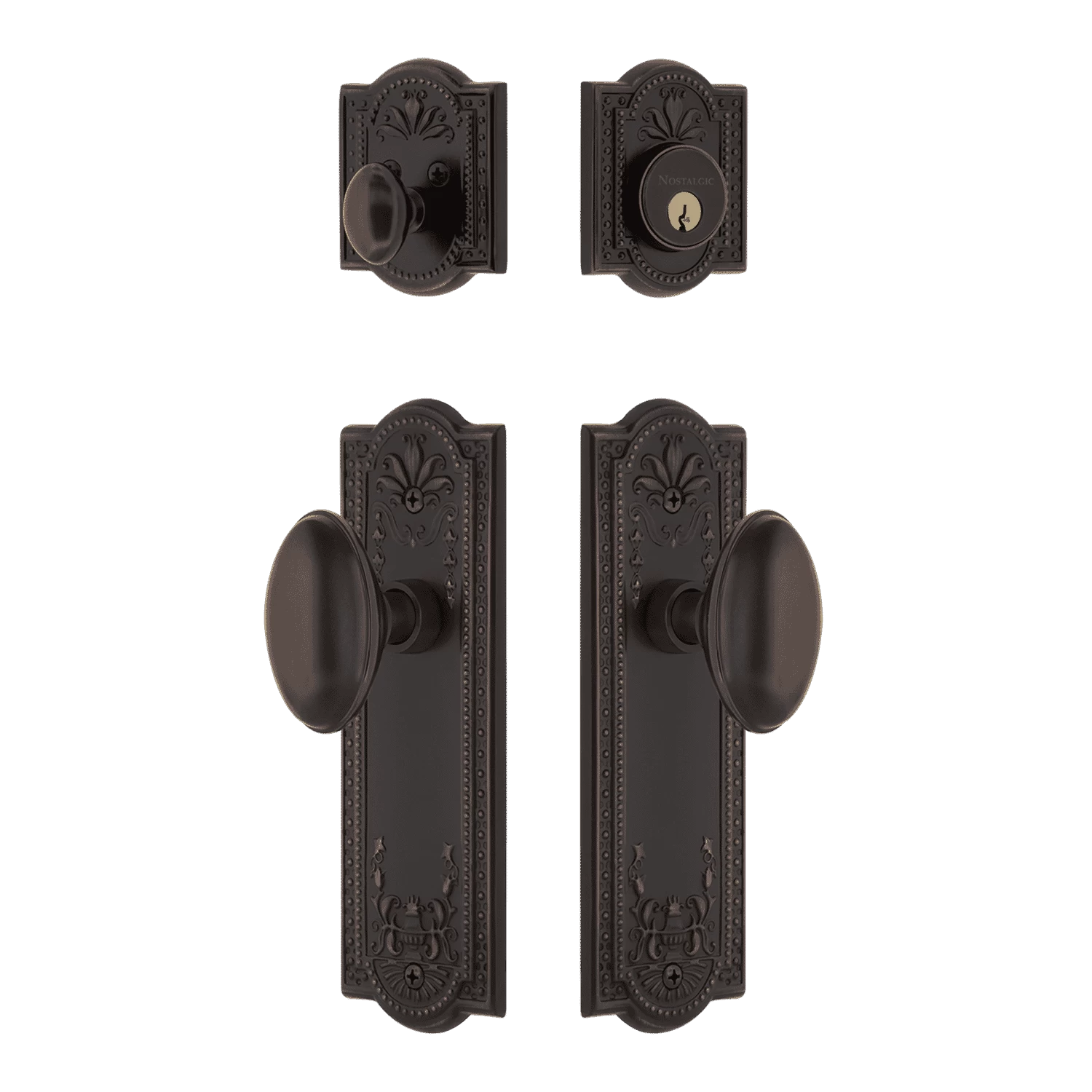 The Meadows Entry Set, with its intricate beaded detailing and botanical flourishes, creates an inspired design theme. Add our Homestead knob with its curvaceous oval shape for a look to enhance any home. The single-cylinder deadbolt features top-quality internal components for smooth, long-lasting operation. All Nostalgic Warehouse products are made from solid forged brass for durability and beauty.