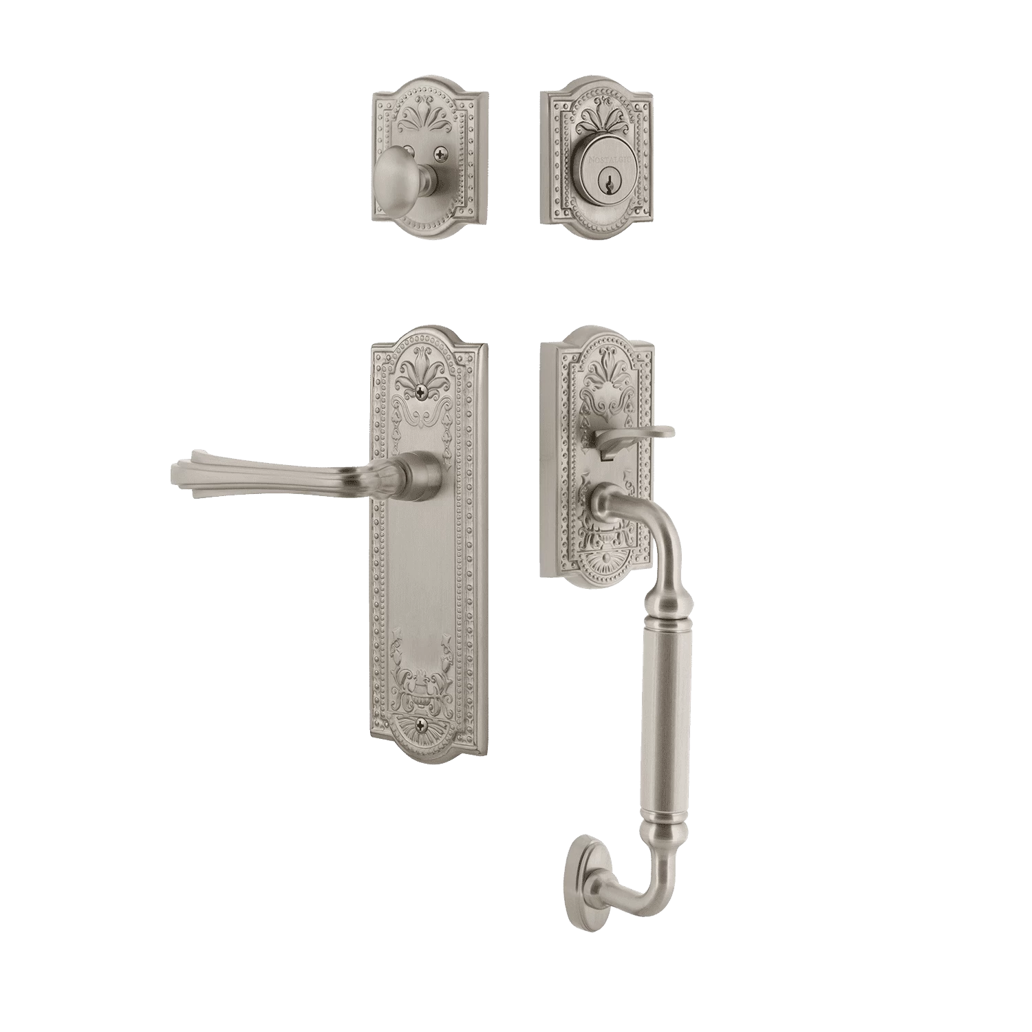 Be the first to review “Meadows Handleset With C-Grip And Meadows Long Plate With Fleur Lever In Satin Nickel” Cancel reply