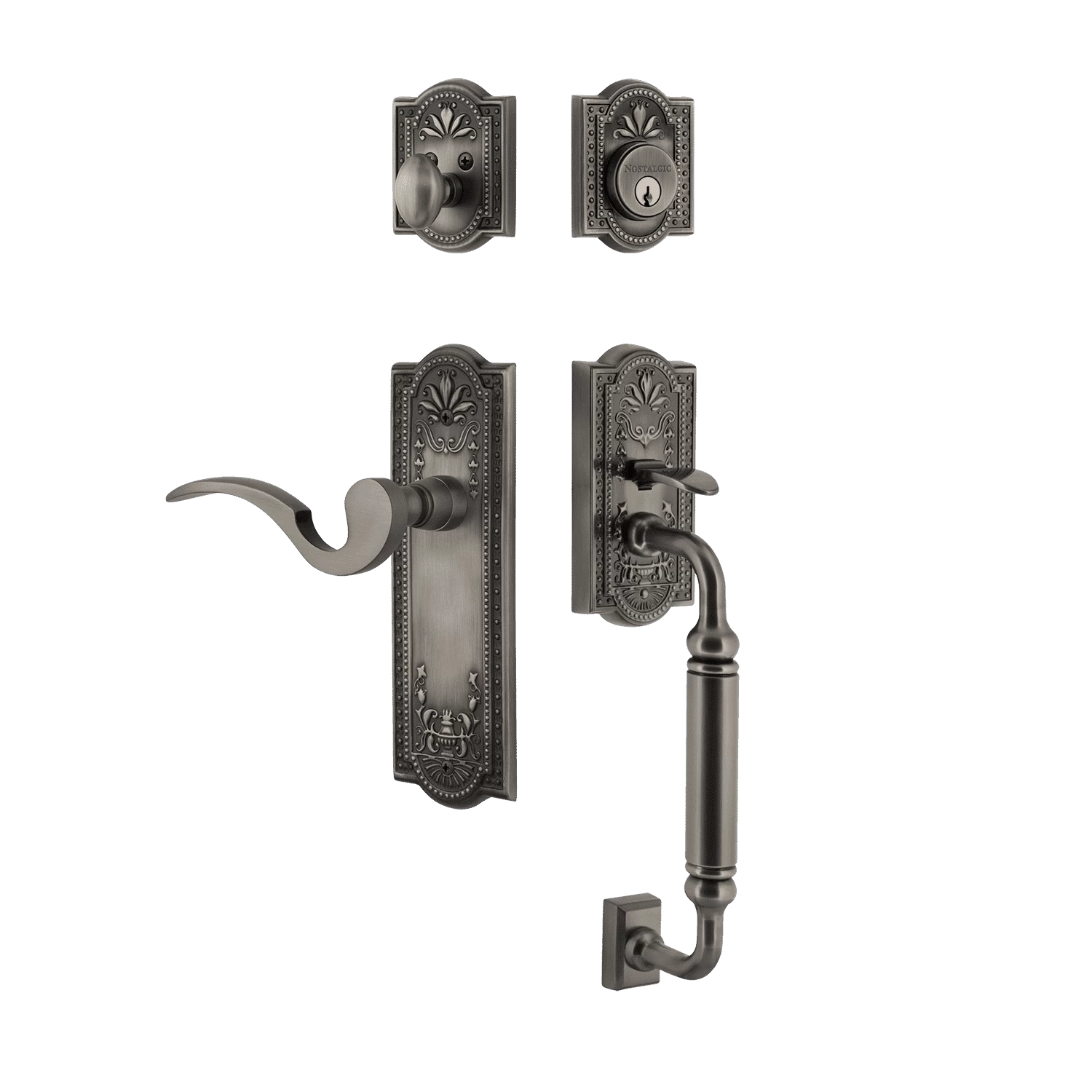 Be the first to review “Meadows Handleset With C-Grip And Meadows Long Plate With Manor Lever In Antique Pewter” Cancel reply