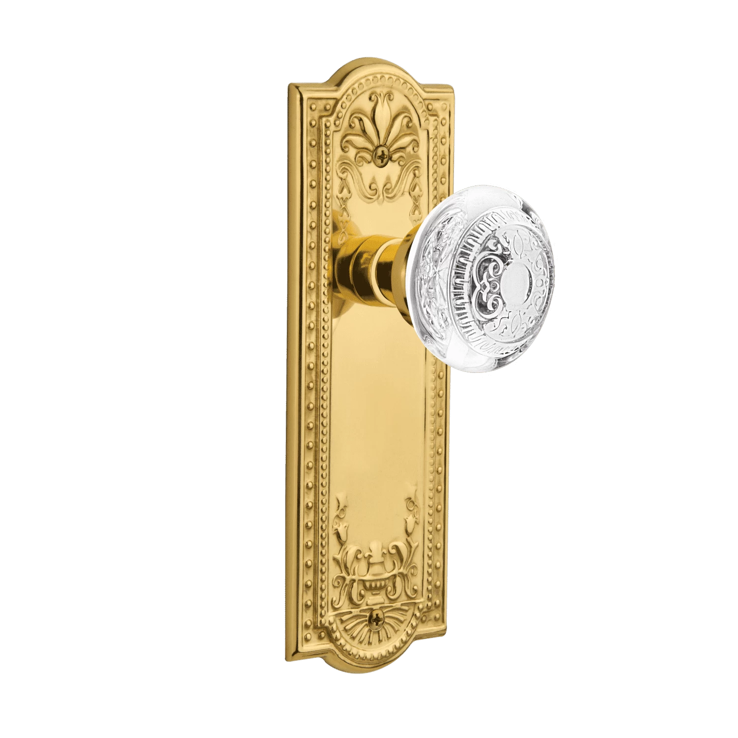 The Meadows Plate, with its intricate beaded detailing and botanical flourishes, creates an inspired design theme. The distinct, crystal Egg and Dart knob highlights the repeating border detail and floral crown center from our brass version, with the added reflection of the crystal.