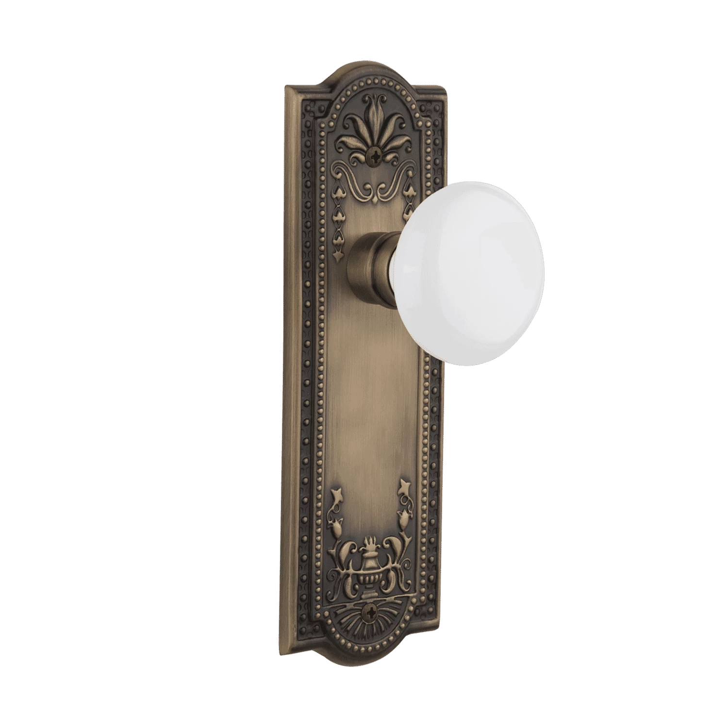 The Meadows Plate, with its intricate beaded detailing and botanical flourishes, creates an inspired design theme. Add a traditional touch with our pure White Porcelain door knob for a simple, yet vintage, look.