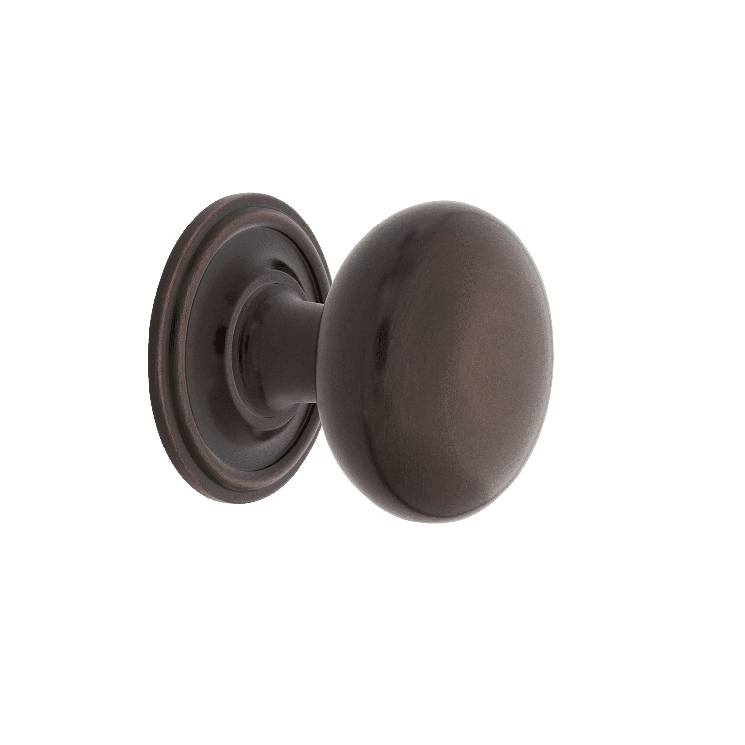 The versatility of the round New York cabinet knob, paired with the Classic cabinet rosette coordinates with any stylish setting.