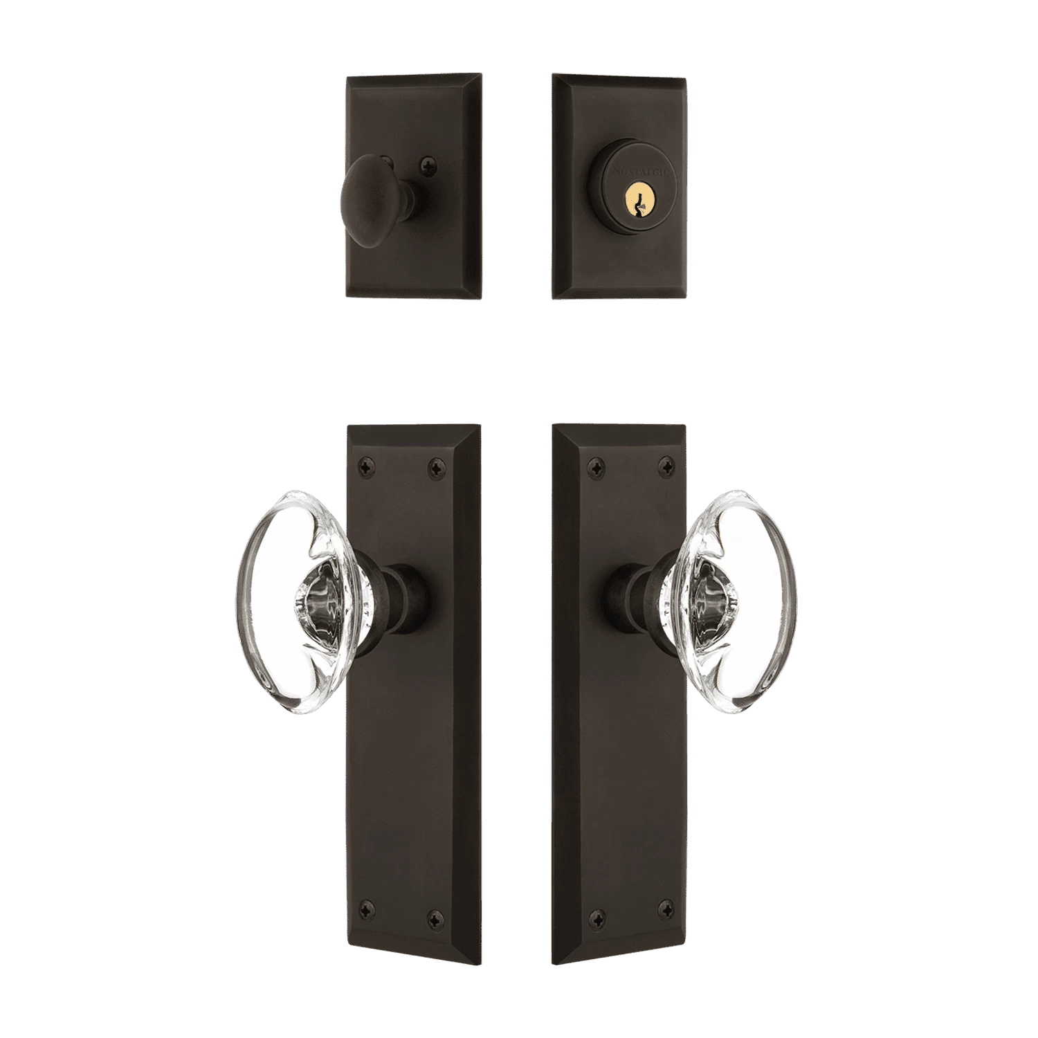 The clean lines and tailored edges of the New York Entry Set have a distinct look that will be in style for years. The Oval Clear Crystal knob, with its clean shape and smooth outward curve, is a perfect accompaniment. The single-cylinder deadbolt features top-quality internal components for smooth, long-lasting operation. All Nostalgic Warehouse products are made from solid forged brass for durability and beauty.