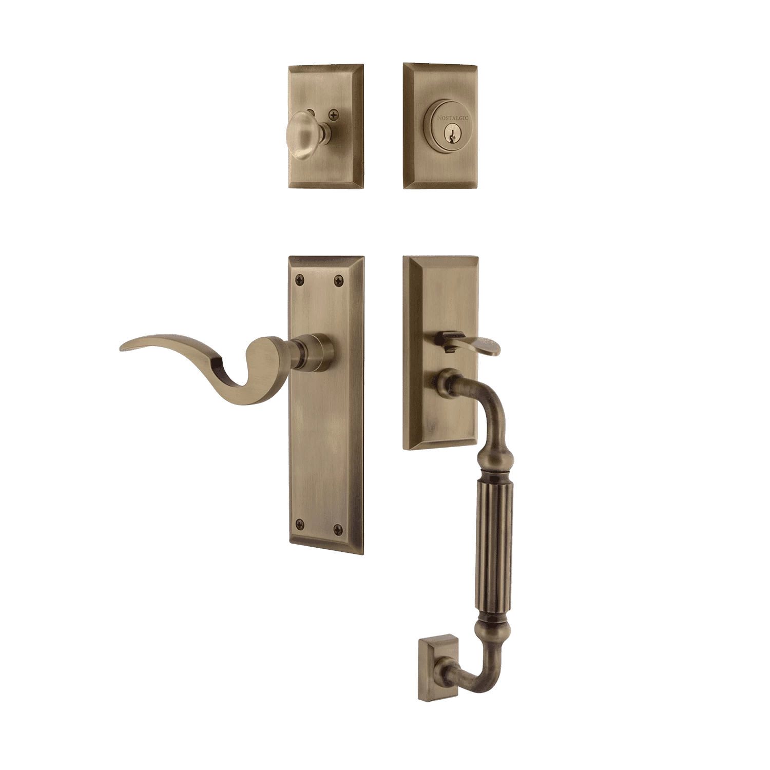 Be the first to review “New York Handleset With F-Grip And New York Long Plate With Manor Lever In Antique Brass” Cancel reply