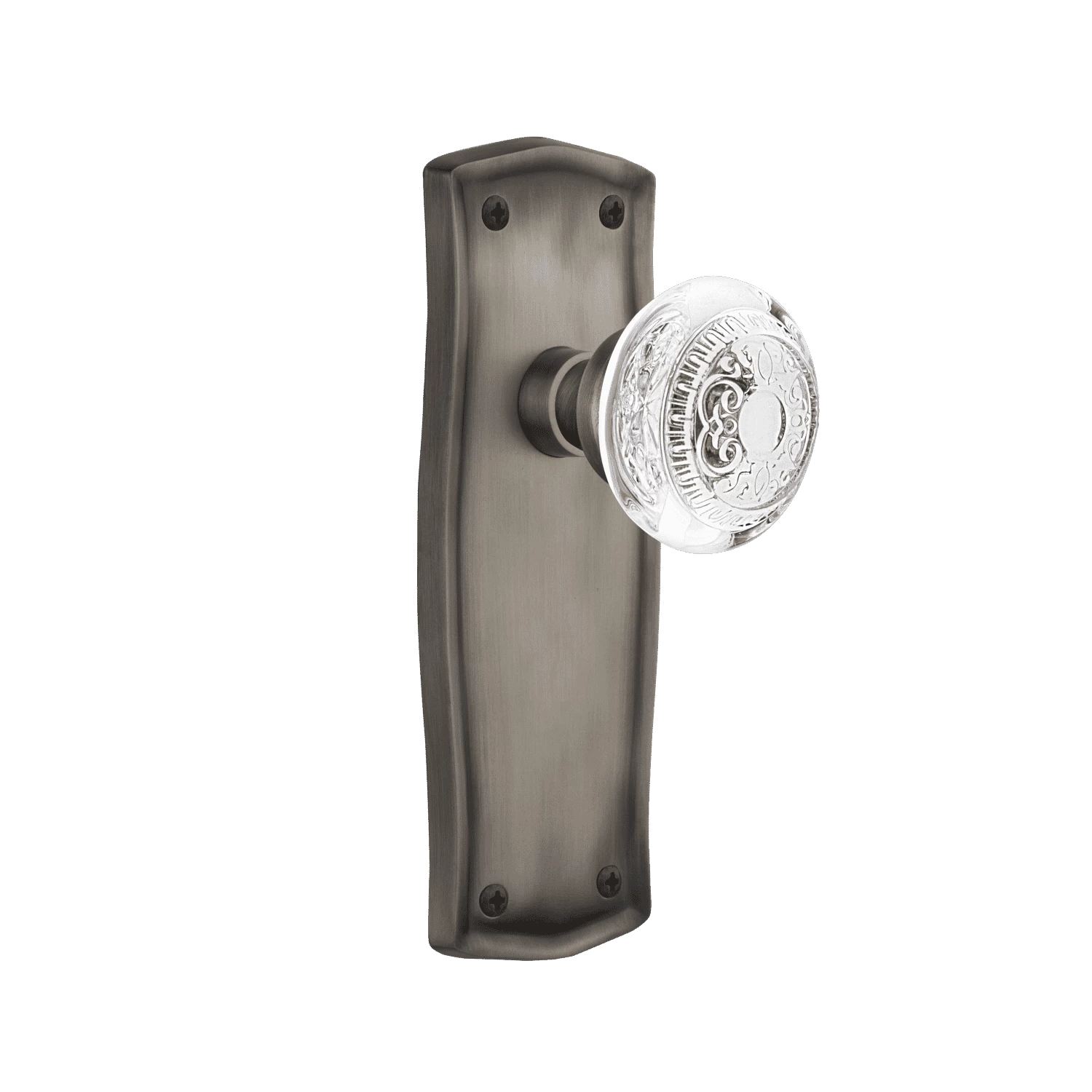 The quiet, discerning restraint of the Prairie Plate evokes a spirit reminiscent of the Craftsman style. The distinct, crystal Egg and Dart knob highlights the repeating border detail and floral crown center from our brass version, with the added reflection of the crystal.