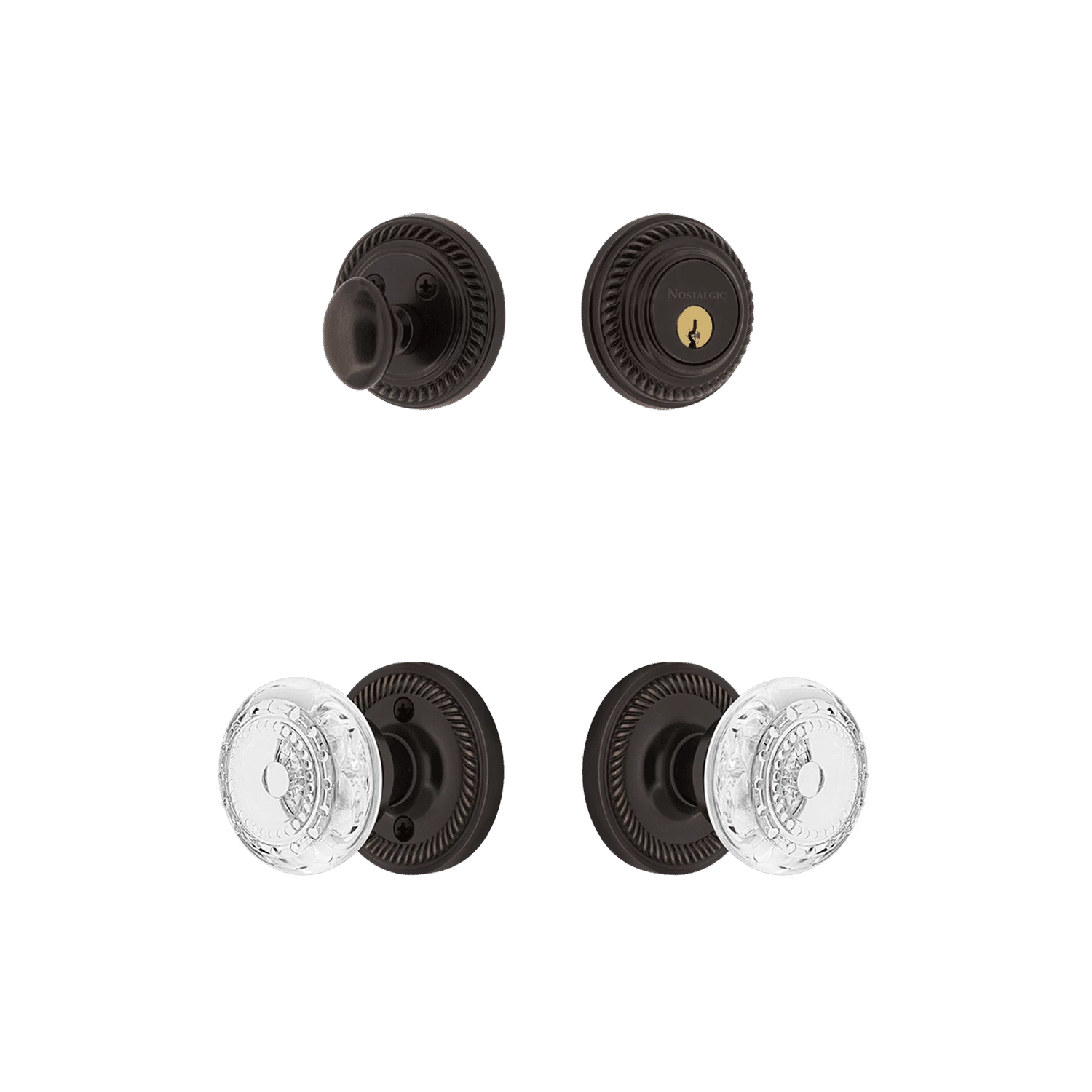 Blending rich detail and subdued refinement, the Rope Entry Set captures a style that has been a favorite for centuries.  Influenced by the Greek Revival, the Crystal Meadows knob adds a touch of sparkle to solid brass backplates. The single-cylinder deadbolt features top-quality internal components for smooth, long-lasting operation. All Nostalgic Warehouse products are made from solid forged brass for durability and beauty.