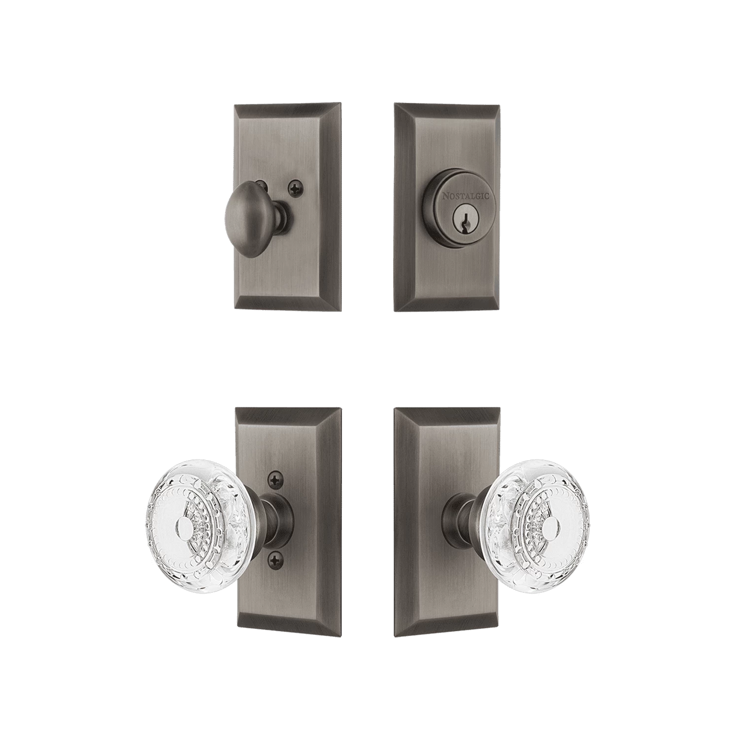 The clean lines of the Studio Short Plate Entry Set coordinate well with many architectural styles.  Influenced by the Greek Revival, the Crystal Meadows knob adds a touch of sparkle to solid brass backplates. The single-cylinder deadbolt features top-quality internal components for smooth, long-lasting operation. All Nostalgic Warehouse products are made from solid forged brass for durability and beauty.