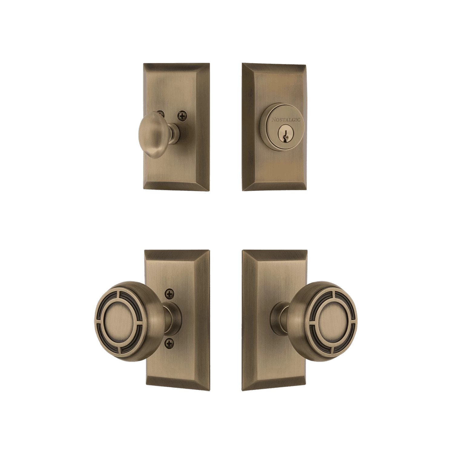 The clean lines of the Studio Short Plate Entry Set coordinate well with many architectural styles.  Pair with the Mission knob and its inlaid step design to create a truly unique appearance. The single-cylinder deadbolt features top-quality internal components for smooth, long-lasting operation. All Nostalgic Warehouse products are made from solid forged brass for durability and beauty.