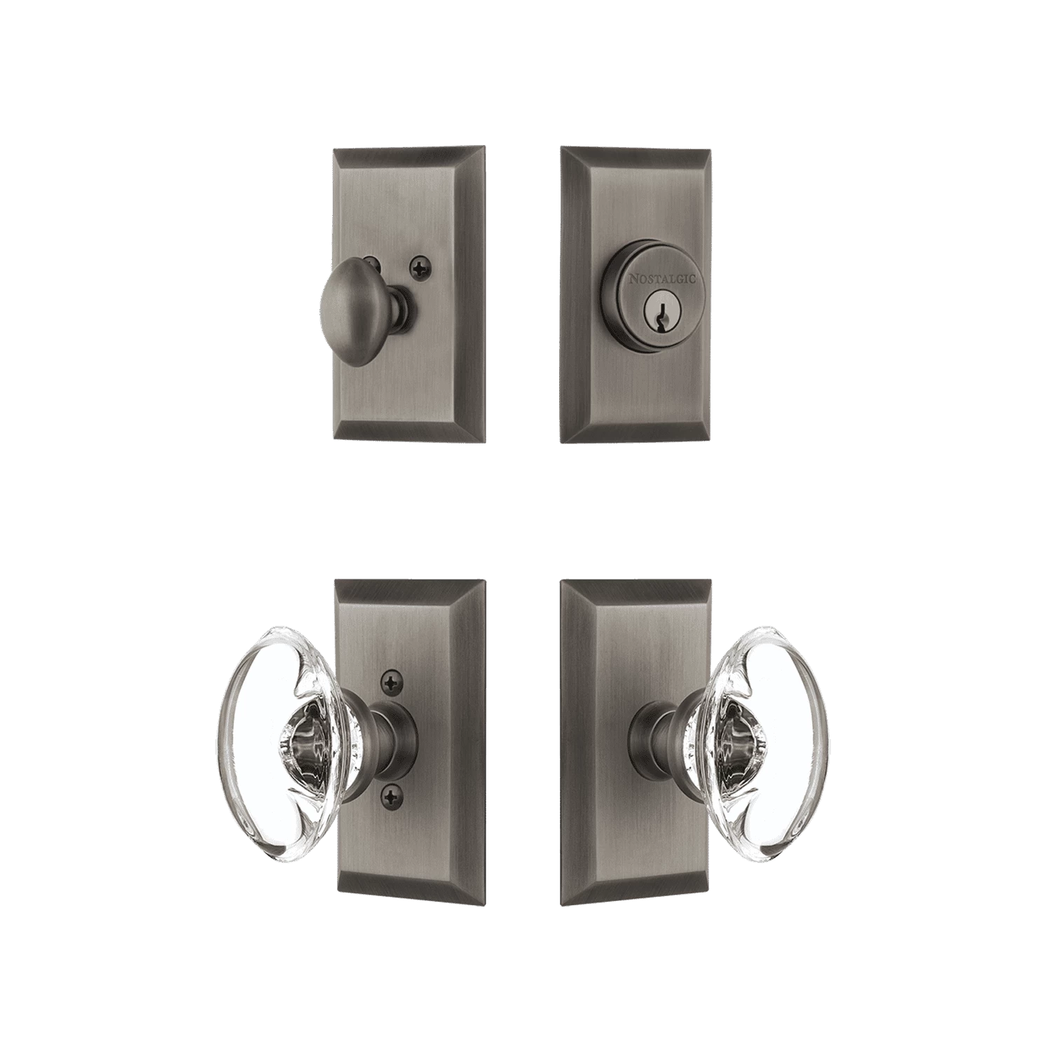 The clean lines of the Studio Short Plate Entry Set coordinate well with many architectural styles.  The Oval Clear Crystal knob, with its clean shape and smooth outward curve, is a perfect accompaniment. The single-cylinder deadbolt features top-quality internal components for smooth, long-lasting operation. All Nostalgic Warehouse products are made from solid forged brass for durability and beauty.