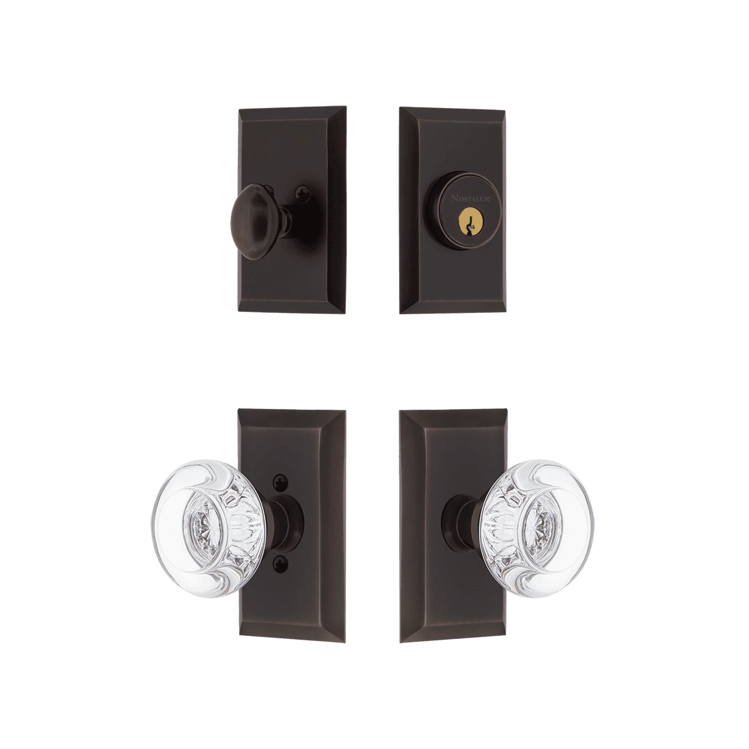 The clean lines of the Studio Short Plate Entry Set coordinate well with many architectural styles.  The Round Clear Crystal knob features a circular shape that magnifies the beautiful facets underneath. The single-cylinder deadbolt features top-quality internal components for smooth, long-lasting operation. All Nostalgic Warehouse products are made from solid forged brass for durability and beauty.