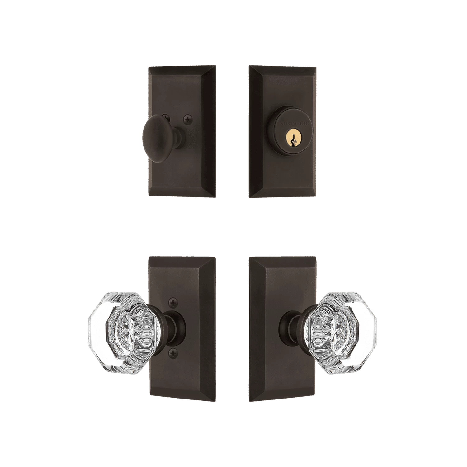 The clean lines of the Studio Short Plate Entry Set coordinate well with many architectural styles.  Pair this with the crisp, clean edges of the Waldorf Crystal knob for a charismatic appearance. The single-cylinder deadbolt features top-quality internal components for smooth, long-lasting operation. All Nostalgic Warehouse products are made from solid forged brass for durability and beauty.
