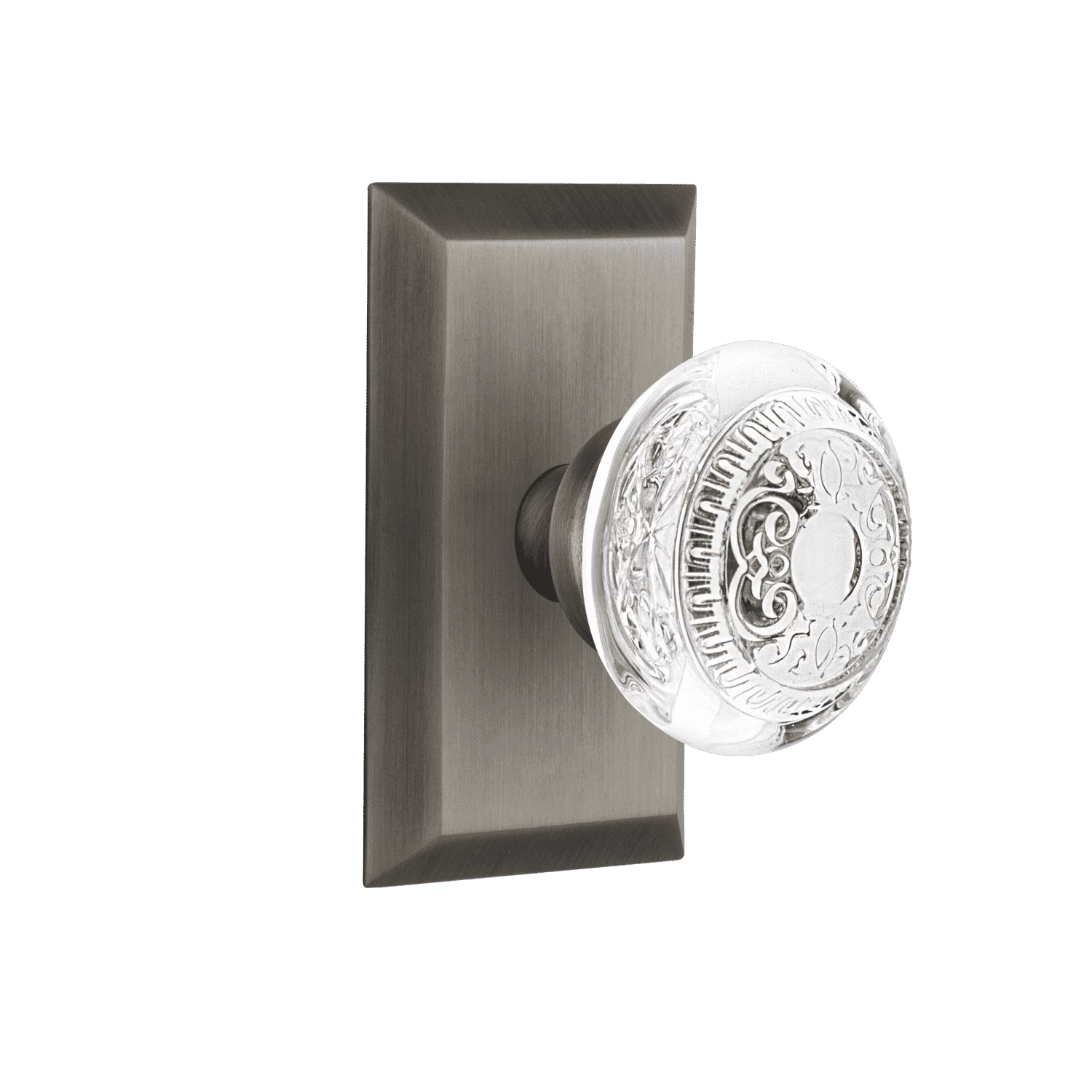 The Studio plate coordinates well with any architectural style, its shorter length is ideal for bedroom or bath but can be used in any room. The distinct, crystal Egg and Dart knob highlights the repeating border detail and floral crown center from our brass version, with the added reflection of the crystal.