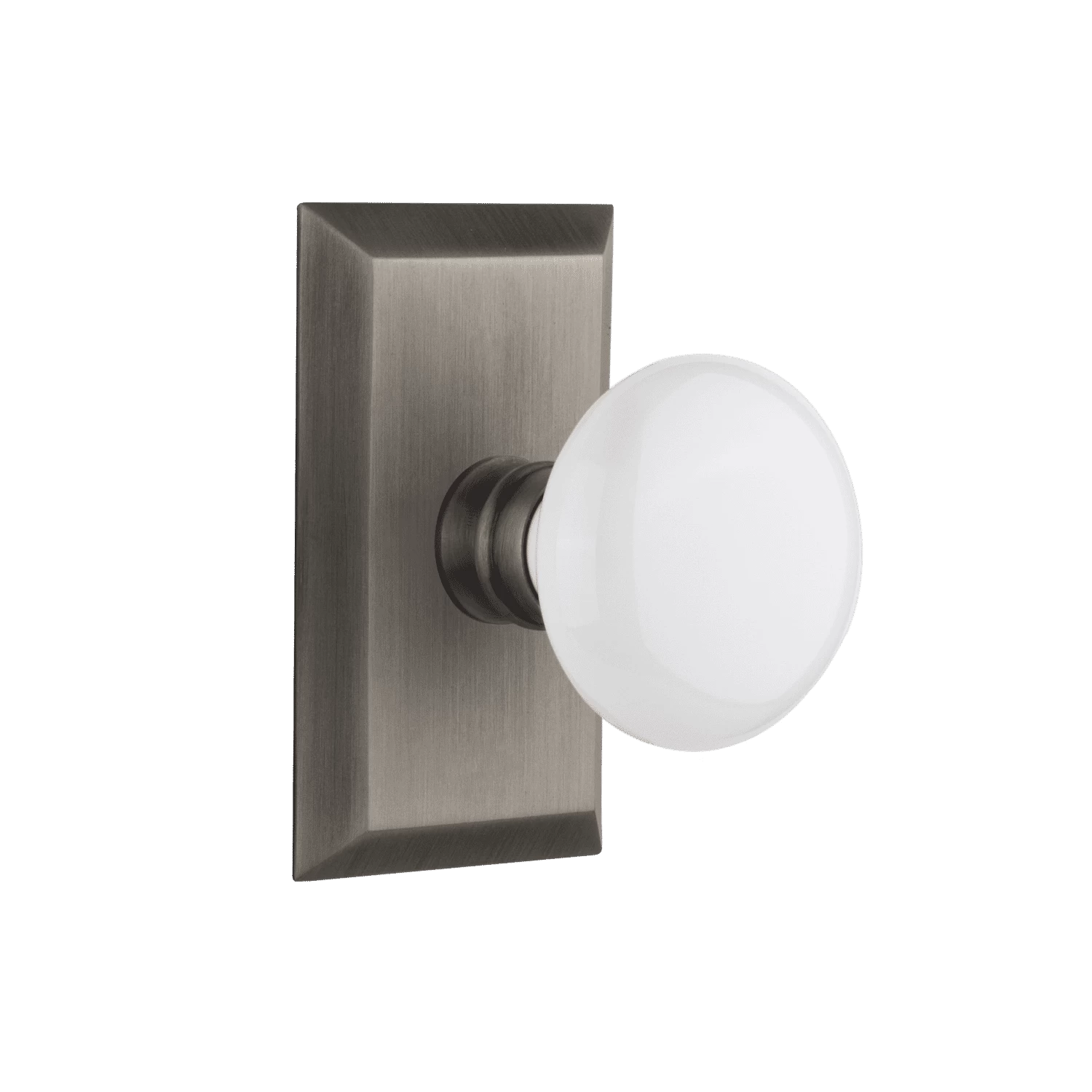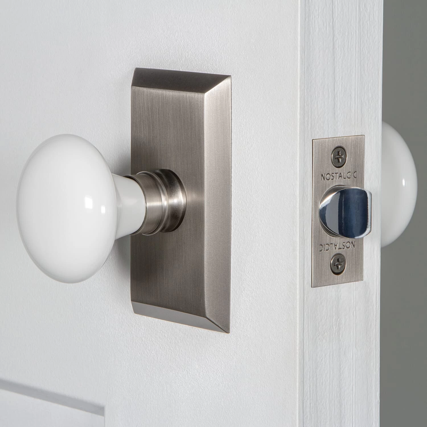 The Studio plate coordinates well with any architectural style, its shorter length is ideal for bedroom or bath but can be used in any room. Add a traditional touch with our pure White Porcelain door knob for a simple, yet vintage, look.