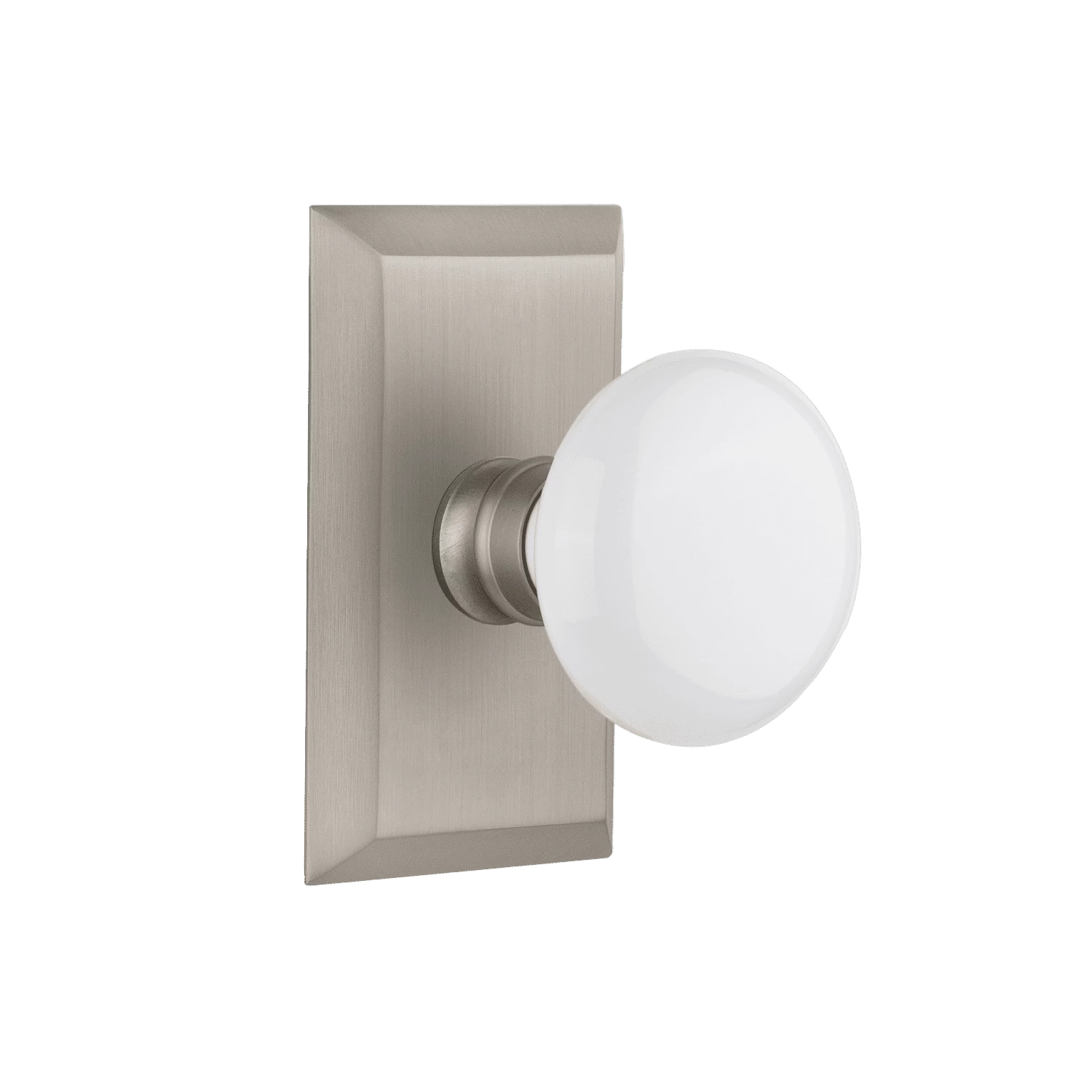 The Studio plate coordinates well with any architectural style, its shorter length is ideal for bedroom or bath but can be used in any room. Add a traditional touch with our pure White Porcelain door knob for a simple, yet vintage, look.