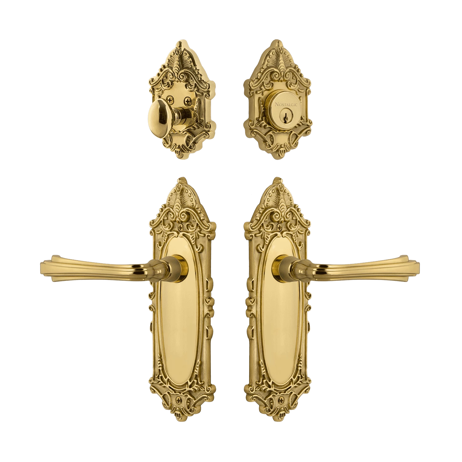The Victorian Entry Set, with its distinct curvilinear embellishment and grand details, is unmistakably old-world vogue. Organic curves and flowing lines give the Fleur lever an almost botanical motif, making it an elegant choice for door details. The single-cylinder deadbolt features top-quality internal components for smooth, long-lasting operation. All Nostalgic Warehouse products are made from solid forged brass for durability and beauty.
