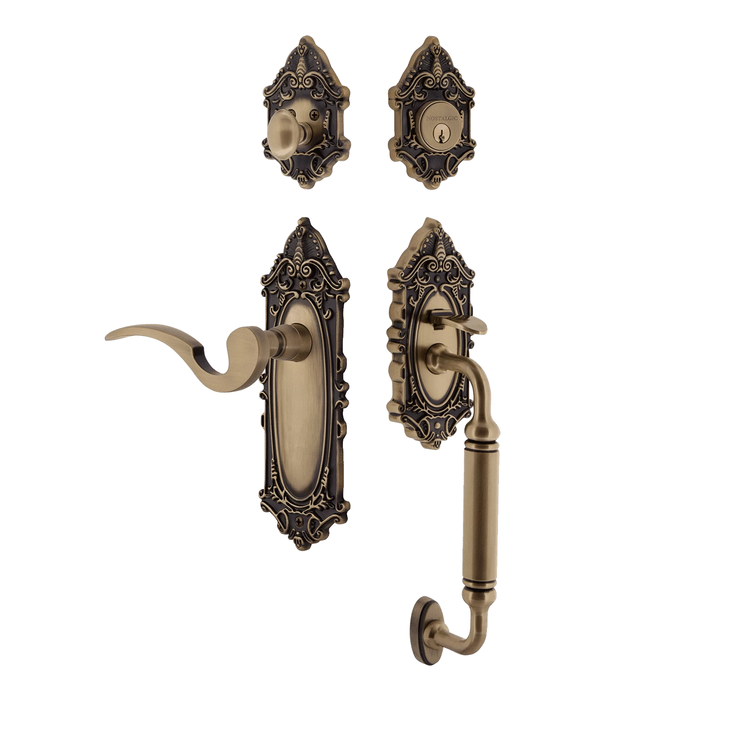 The Victorian Exterior Handleset, with its distinct curvilinear embellishment, is unmistakably old world vogue. All Nostalgic Warehouse handlesets are mounted on a solid (not plated) forged brass base for durability and beauty.