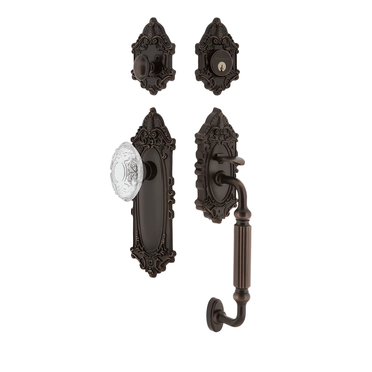 Be the first to review “Victorian Plate F Grip Entry Set Crystal Victorian Knob In Timeless Bronze” Cancel reply