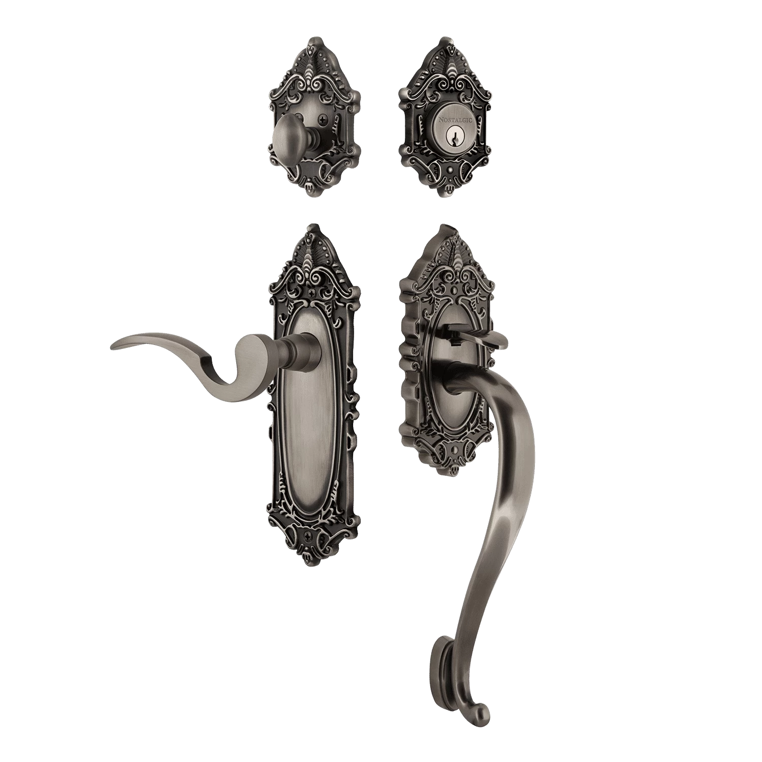 The Victorian Exterior Handleset, with its distinct curvilinear embellishment, is unmistakably old world vogue. All Nostalgic Warehouse handlesets are mounted on a solid (not plated) forged brass base for durability and beauty.